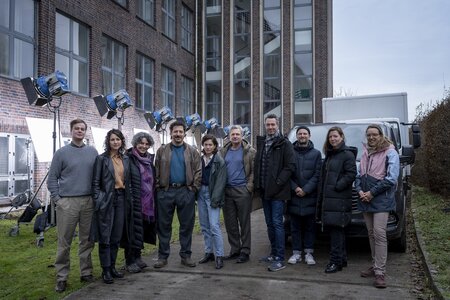 Am Set im Dessau-Roßlau kamen für ein Foto zusammen: Marius Ahrendt (Cast), Eva Meckbach (Cast), Konstanze Wendt (MDM), Fahri Yardim (Cast), Henriette Confurius (Cast), Jörg Witte (Cast), Stephan Rick (Regie), Björn Vosgerau (Produzent Wüste Film), Dana Messerschmidt (MDM), Antje Mutzeck (Staatskanzlei Sachsen-Anhalt) (v.l.n.r.)