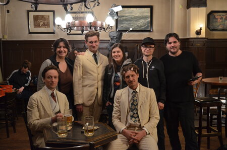 Am Set im Beyerhaus Leipzig: Regisseurin Gerda Leopold, Lukas Watzl (Darsteller Egon Schiele), Sarah Weding (MDM), Michael Geidel (Actrio Studio) und Sebastian Endler (Kamera) mit weiteren Darstellern (v.l.n.r.)